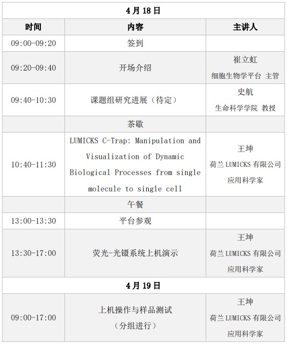 本次“動態單分子”成像研討會,特別邀請了清華大學生命科學學院的史航教授分享課題組最新的研究進展;荷蘭LUMICKS有限公司的應用專家王坤將全面介紹C-Trap®熒光-光鑷系統的最新功能,歡迎大家蒞臨現場!