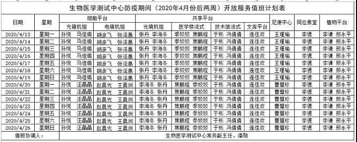為了保障各實驗室科研測試需求,同時響應新型冠狀病毒防疫號召,生物醫學測試中心所屬各個平臺/機組4月份將繼續安排值班,4月后兩周的值班安排如下: