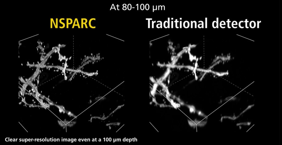 AXR NSPARC是在AXR上升級了最新研發的空間陣列共聚焦探測器,其通過全新水準的超低噪聲高靈敏度空間探測能力進一步擴展了共聚焦成像潛能,使分辨率提升到100nm,并提高了圖像信噪比。